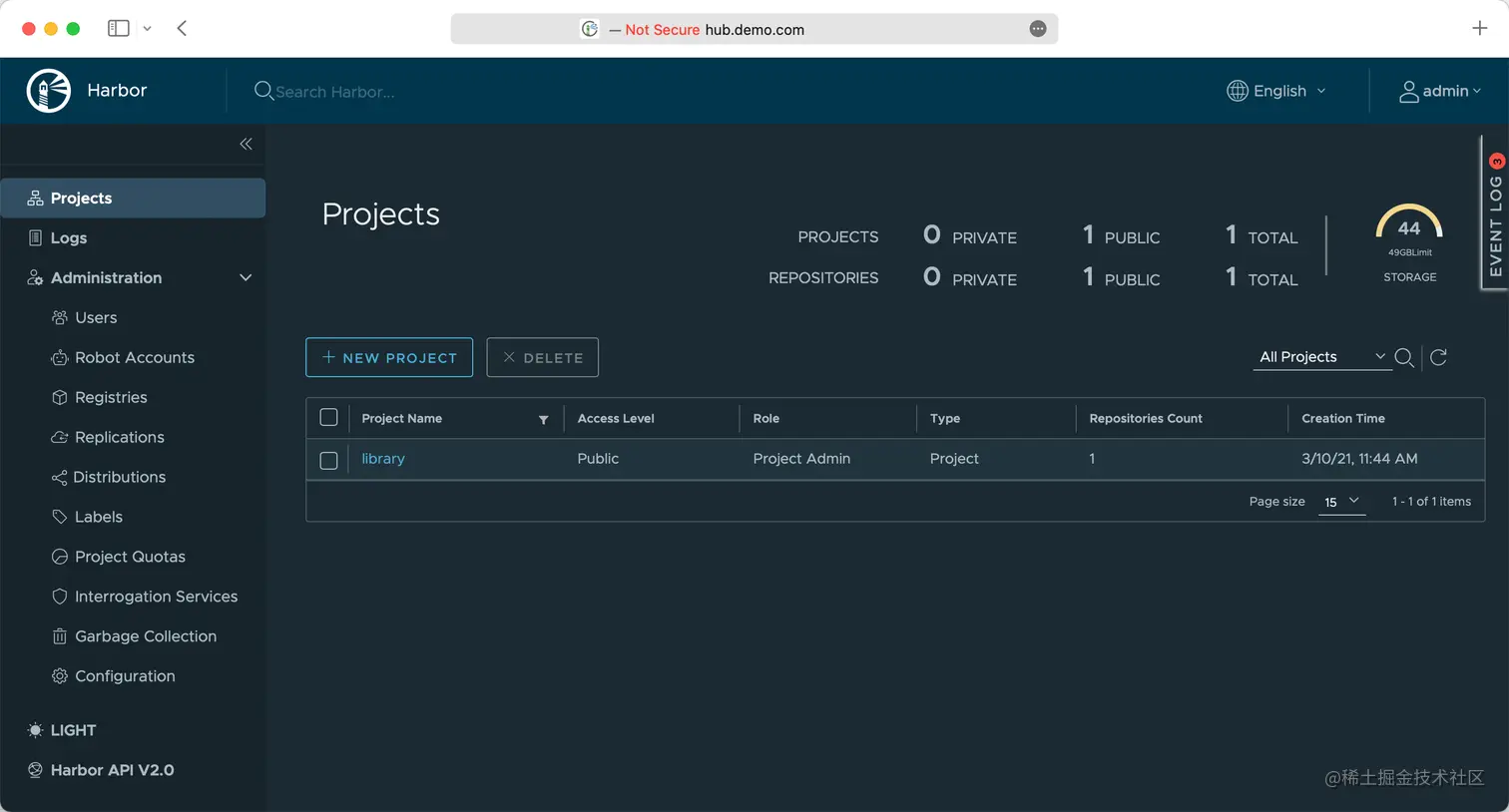 用户名admin,密码是在harbor.yml中配置的,登录后界面如下: