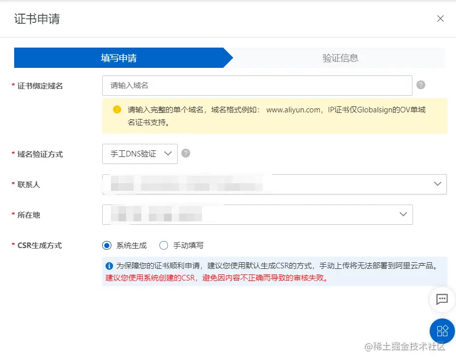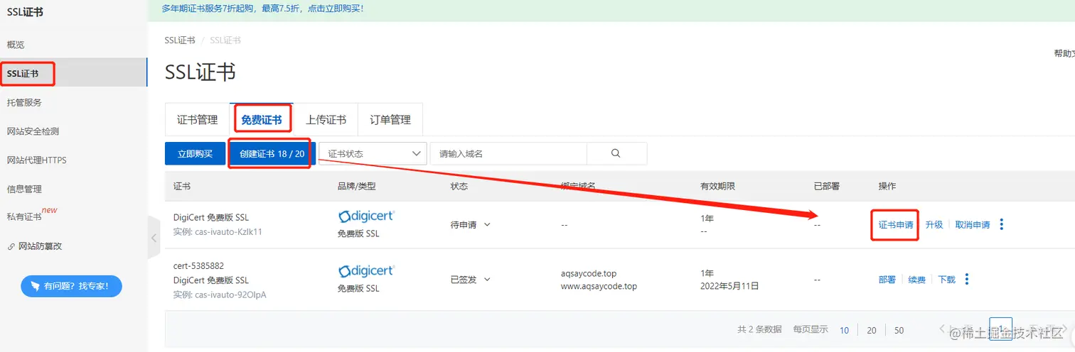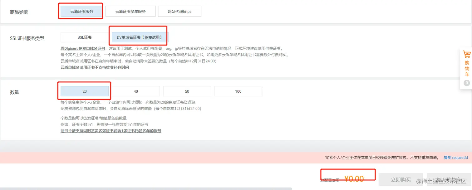 打开SSL证书申请,前往云盾书服务购买DV单域名证书【免费】,支付0元获取。