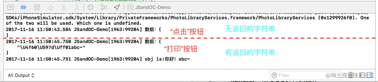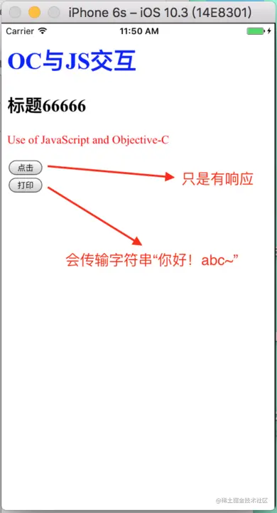 #import "JSObject.h"- (void)webViewDidFinishLoad:(UIWebView *)webView{ // 初始化content self.context = [webView valueForKeyPath:@"documentView.webView.mainFrame.javaScriptContext"]; //js交互 JSObject *JsObj = [JSObject new]; self.context[@"Android"] = JsObj; //key值 }效果: