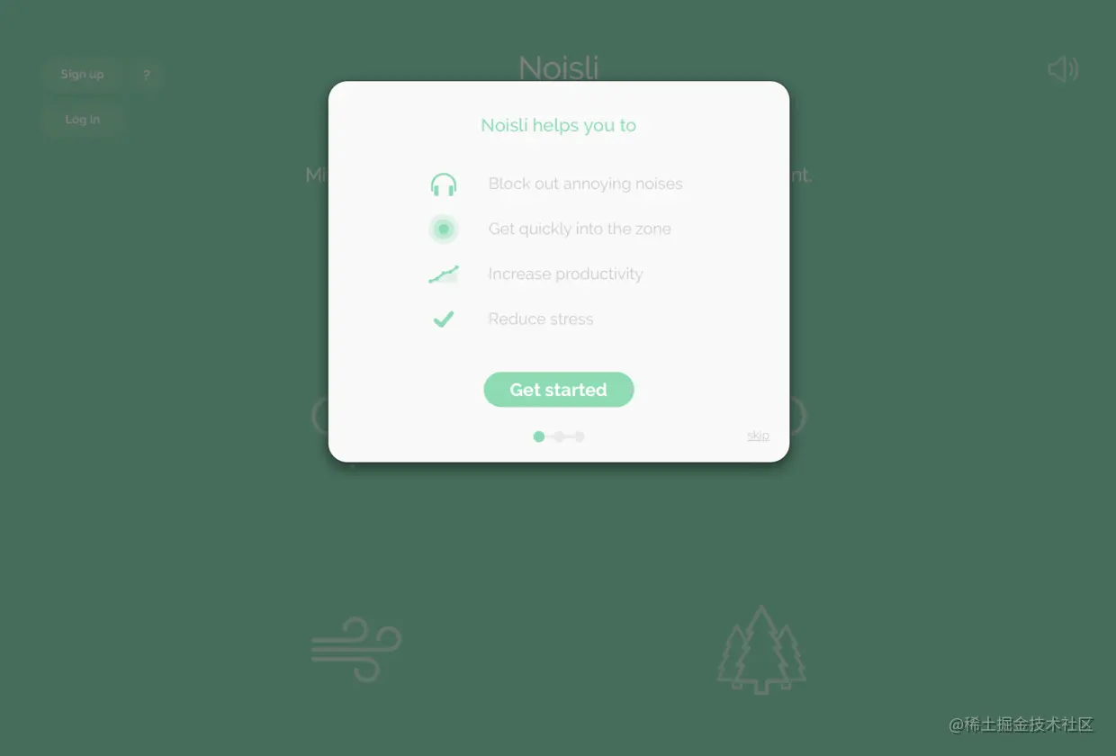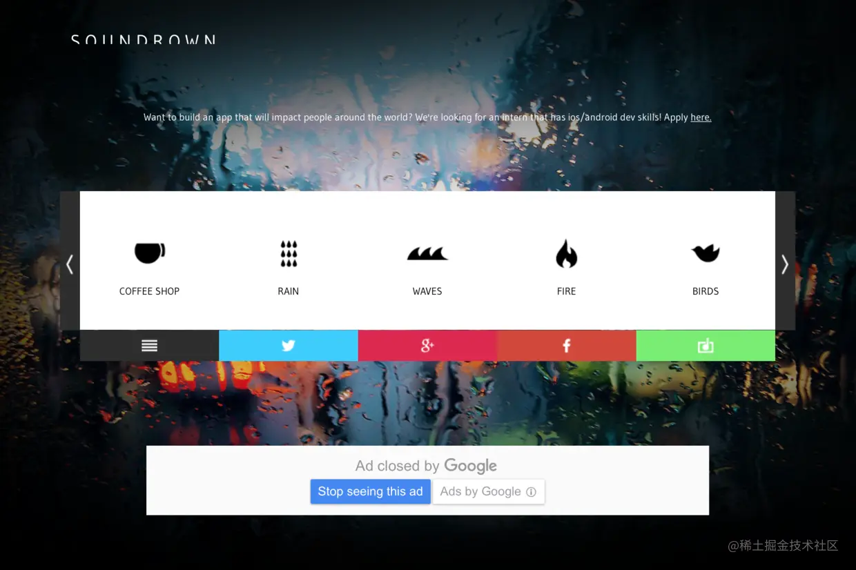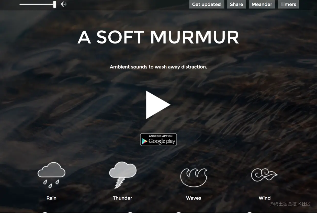 soundrown.com 网站一进去,有 3 个关键词:放松、专注、逃离。的确,它成功做到了这一点。它有 10 种不同的声音帮助你放松心情,也可以混合使用。不同的声音对应不同的背景,网站非常有设计感,相信你会重新回来体验一次。