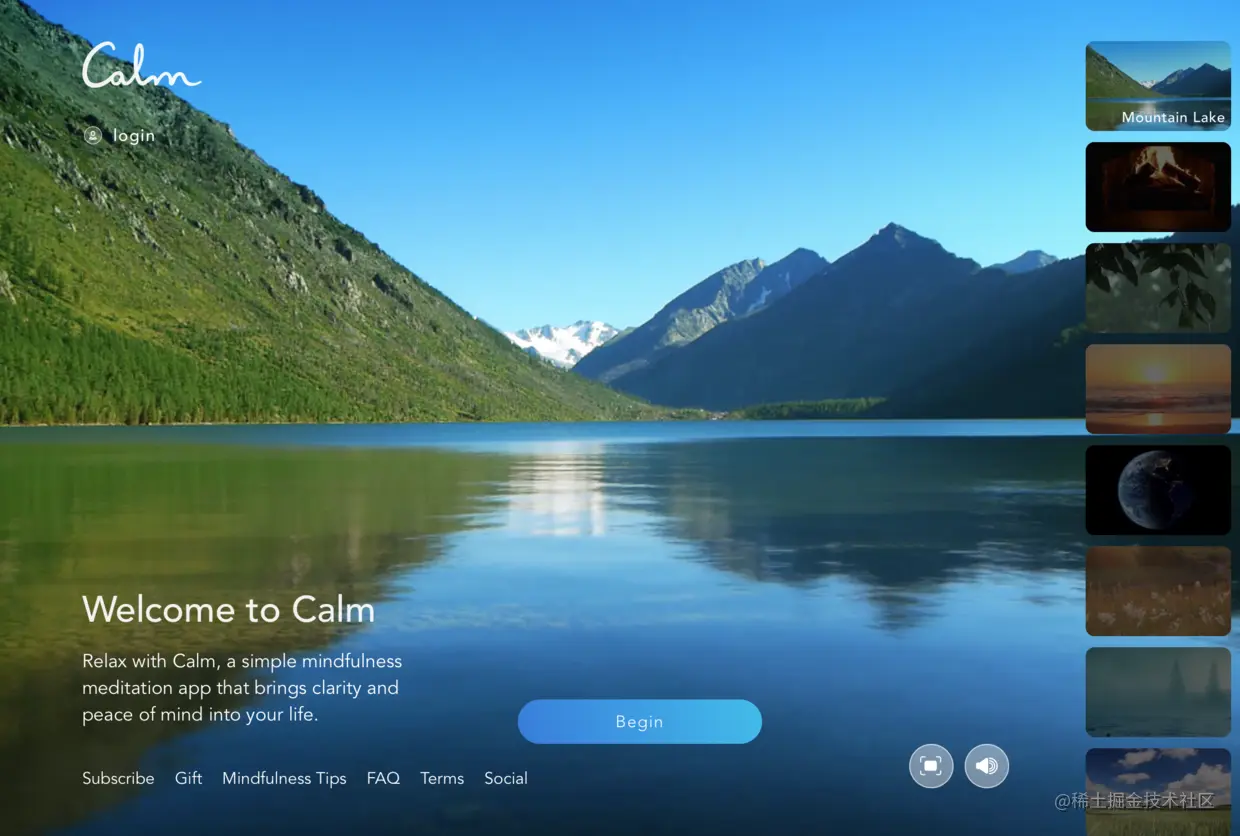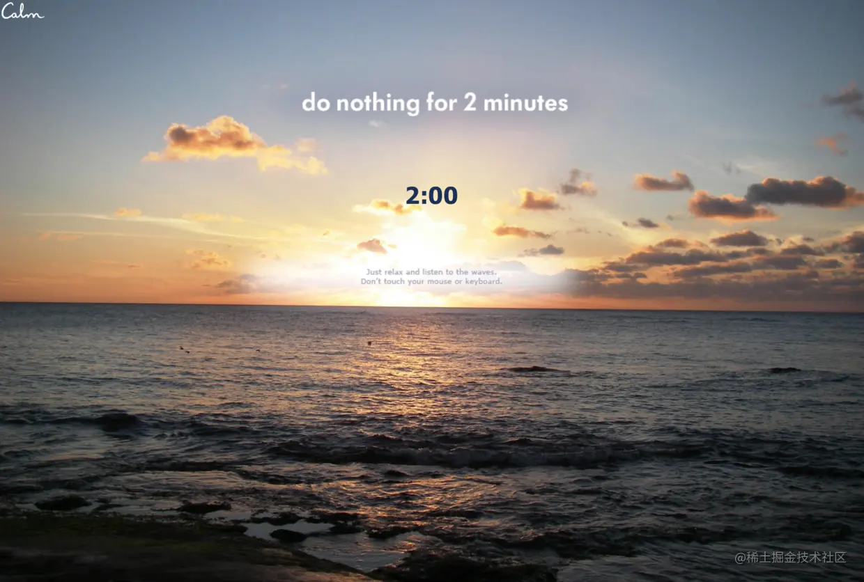 www.calm.com 这是同类型中最火的网站了,站如其名,「平和」,通过自然的图像(阳光下的暖流、淙淙的小溪等)与缓缓的音乐,帮你在短时间内放松下来。