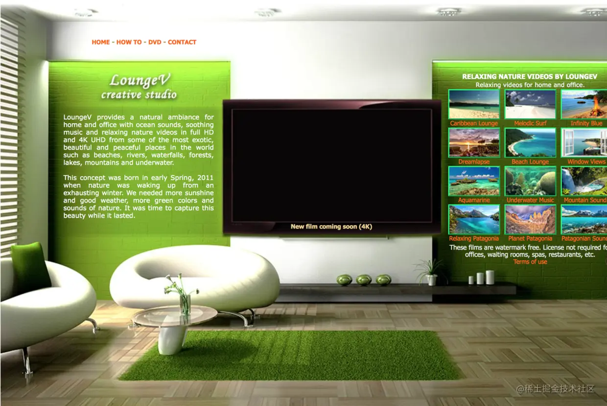 www.loungev.com 前三个都是图像,现在来个新鲜的。这个网站提供高清的自然风光视频 + 音乐。有沙滩、瀑布、水下景色等等,网站背景是一个温馨的客厅,右侧有视频可选,对喜欢看视频的同学来说,还是蛮不错的。