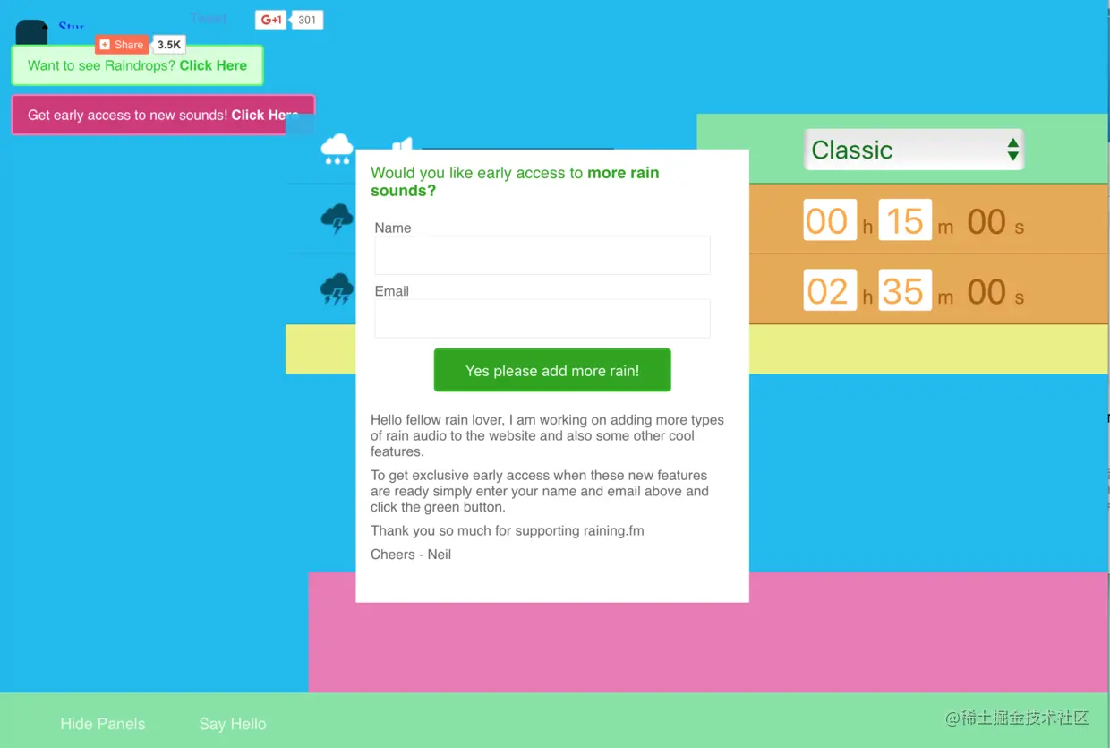 raining.fm 有时候,我们需要的仅仅是一点点雨声来帮助我们平静。网站专门提供雨声,因为单一,所以也更加专业。网站有 3 种不同的雨声类型,右侧有定时器可以在你放松时提醒你,简单也好用的一个网站,赞一个。