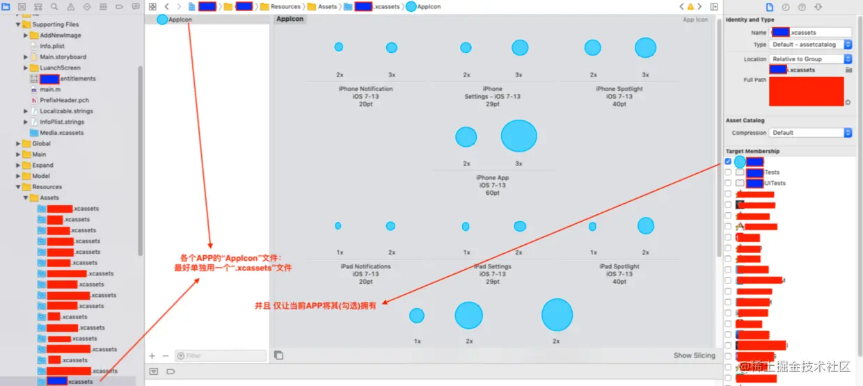 “结论:当**".xcassets"文件包含某个APP的‘AppIcon’文件就只能被该APP**所(勾选)拥有!”