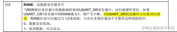 当Data1、Data2、Data3、Data4每一个数据到来时串口产生的中断为 RXNE:读数据寄存器非空中断。具体的相关介绍可以在状态寄存器(USART_SR)中查看。