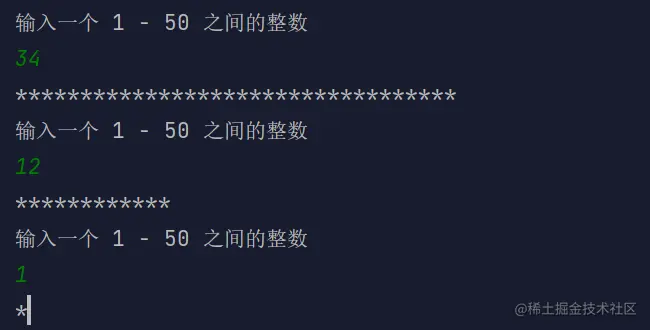 读取 7 个数(1 - 50)的整数值,每读取一个值,就打印该值个数的 *;