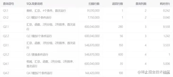 以下性能测试的所有分析 SQL 都在这张大宽表中运行,未进行表关联查询。