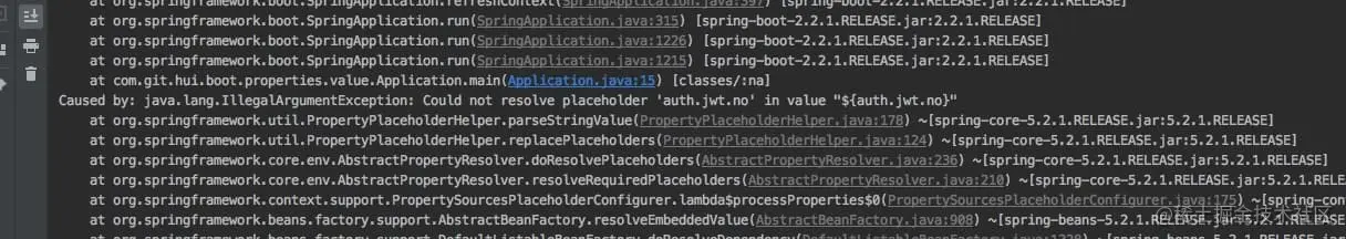 抛出的异常属于BeanCreationException, 对应的异常提示 Caused by: java.lang.IllegalArgumentException: Could not resolve placeholder 'auth.jwt.no' in value "${auth.jwt.no}"