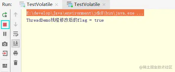 从图中可以看到,该程序并没有结束,也就是死循环。说明主线程读取到的flag还是false,可是另一个线程明明将flag改为true了,而且打印出来了,这是什么原因呢?这就是内存可见性问题。