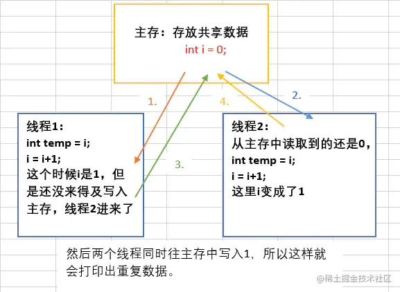 看到这里,好像和上面的内存可见性问题一样。是不是加个volatile关键字就可以了呢?其实不是的,因为加了volatile,只是相当于所有线程都是在主存中操作数据而已,但是不具备互斥性。比如两个线程同时读取主存中的0,然后又同时自增,同时写入主存,结果还是会出现重复数据。