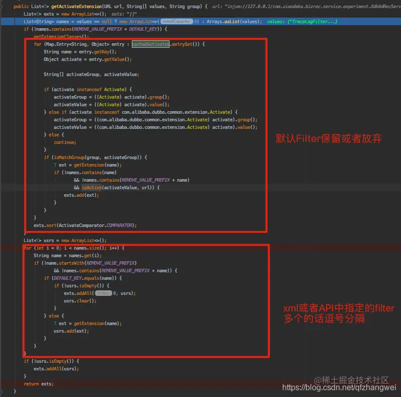 // Filter总的选择流程:先加载默认Activate和自定义的,但排除xml或者注解中指定的。一般在org/apache/dubbo/dubbo/2.7.3/dubbo-2.7.3.jar!/META-INF/dubbo/internal包下定义好的。