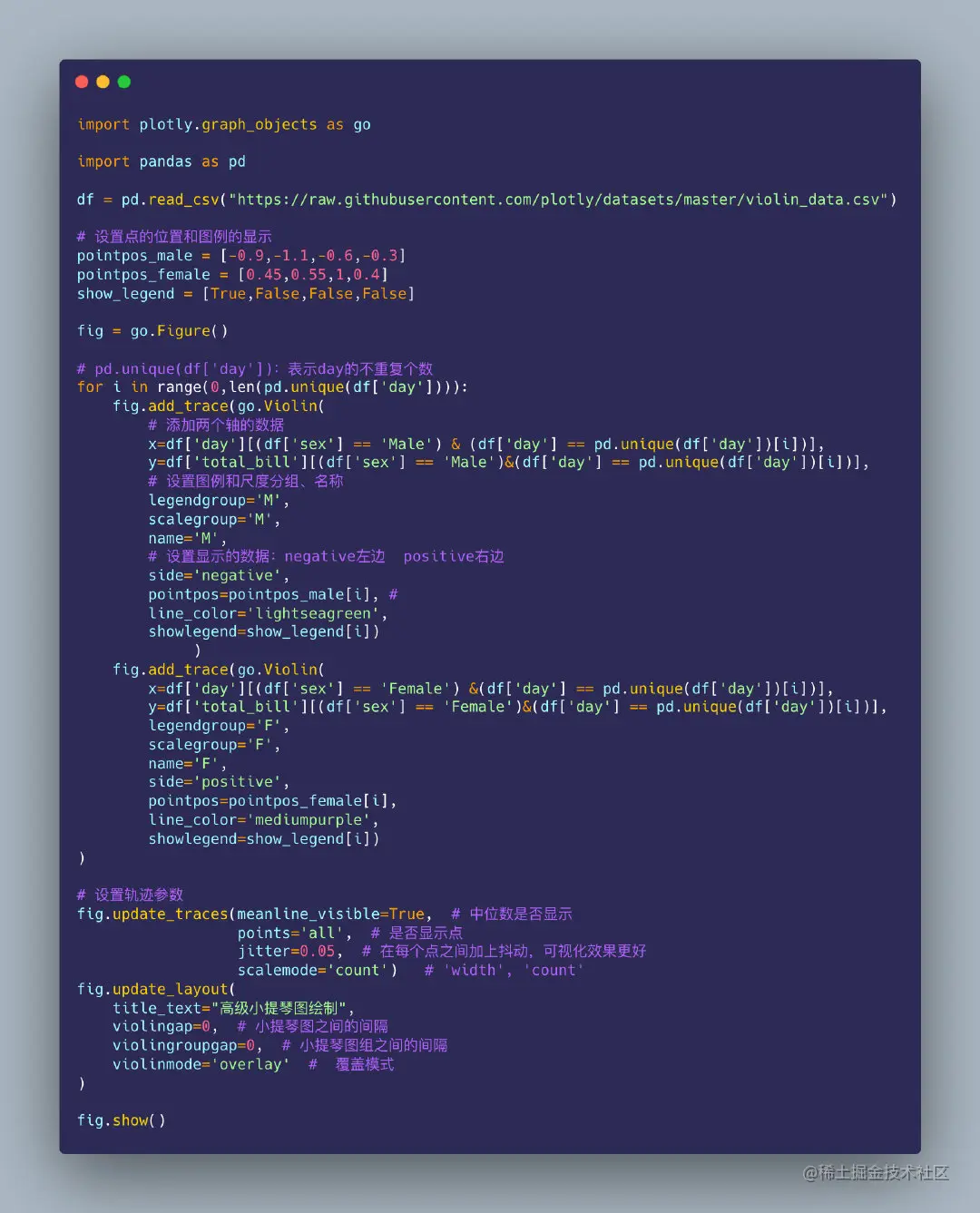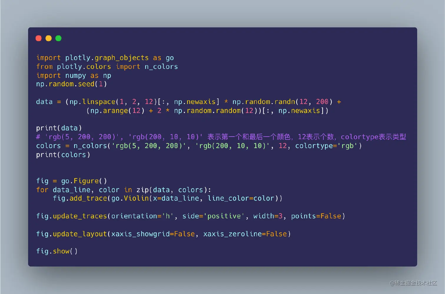 在之前的Plotly文章中已经介绍过如何利用Plotly制作柱状图、散点图、饼图等常见的可视化图形,还有K线图和箱型图,本文介绍如何利用Plotly来绘制小提琴🎻图,也是一种统计类的图形,基于两种方法实现::