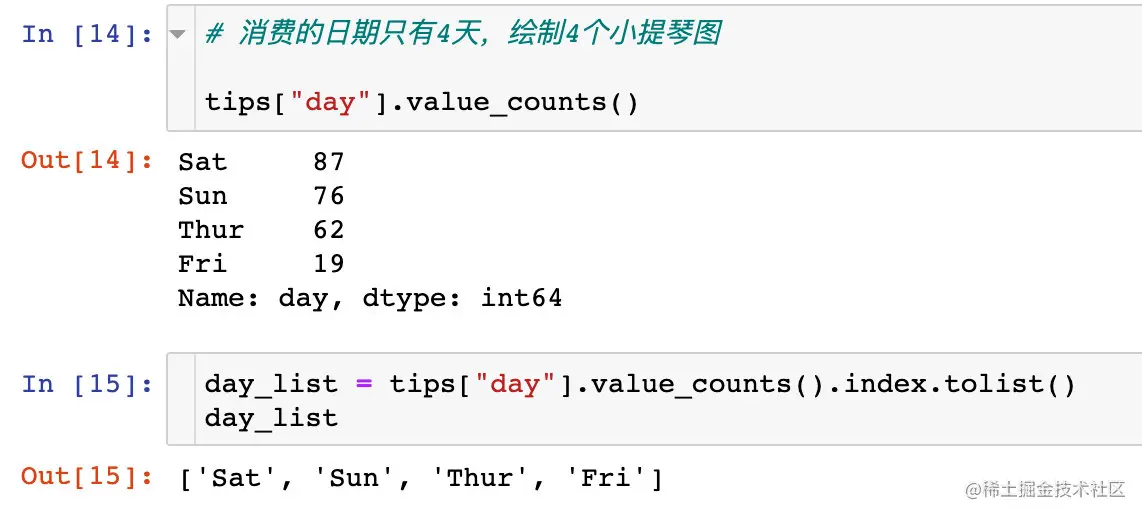在一个画布中同时绘制多个小提琴图。在消费数据tips中的day字段有4个不同的取值: