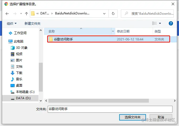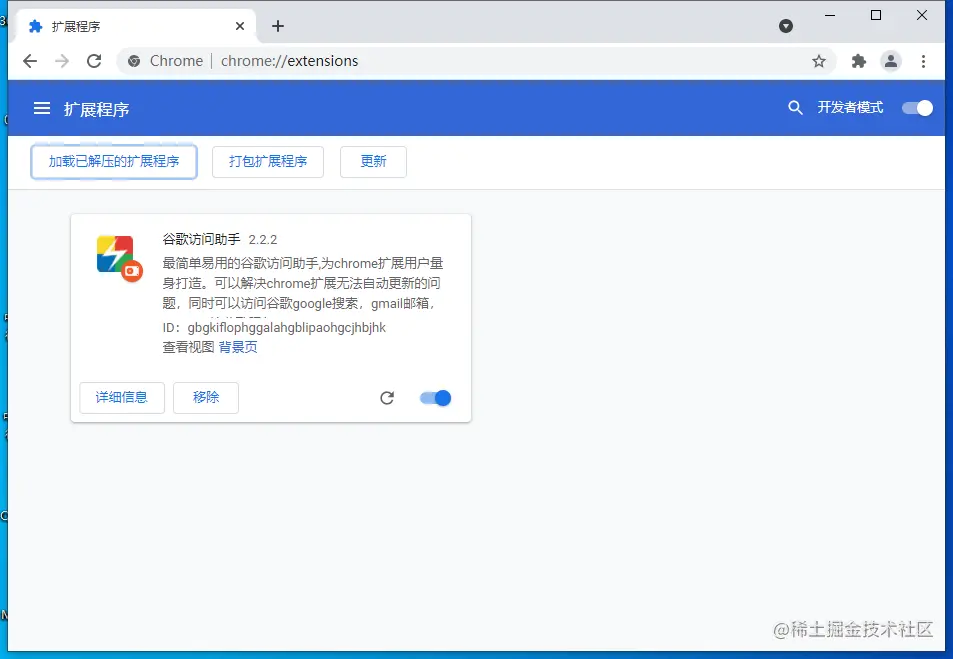 谷歌浏览器安装扩展程序访问助手 正在努力中的杨Sir 2021-06-12 984 阅读1分钟 1、点开右上角三个小点 2、选择更多工具 3、选择扩展程序 4、点击开发者模式 5、选择加载已解压的扩展程序 6、选择文件夹,谷歌访问助手 7、加载成功 谷歌浏览器安装扩展程序谷歌访问助手,需要插件联系邮箱:944636892@qq.com