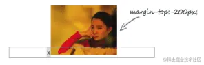 此时,按照理解, -200px 远远超过图片的高度,图片应该完全跑到容器的外面,但是,图片依然有部分在.box 元素中,而且就算 margin-top 设置成-99999px,图片也不会继续往上移动,完全失效。其原理和上面图片底部留有间隙实际上是一样的,图片的前面有个“幽灵空白节点”,**而在 CSS 世界中,非主动触发位移的内联元素是不可能跑到计算容器外面的,**导致图片的位置被“幽灵空白节点”的 vertical-align:baseline 给限死了。我们不妨把看不见的“幽灵空白节点”使用字符 x 代替,原因就一目了然了。