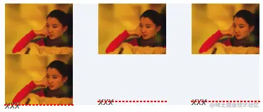 现在行高 line-height 是 0,则字符x-baseline 行间距就是-1em,也就是高度为 0,由于 CSS 世界中的行间距是上下等分的,因此,此时字符 x-baseline 的对齐点就是当前内容区域(可以看成文字选中背景区域)的垂直中心位置。 x-baseline 使用的是微软雅黑字体,字形下沉明显,因此,内容区域的垂直中心位置大约在字符 x 的上面 1/4 处。而这个位置就是字符 x-baseline 和最后一行图片下边缘交汇的地方。