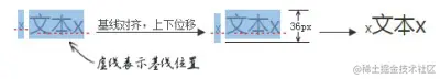 其中有一个很关键的点,那就是 24px 的 font-size 大小是设置在<span>元素上的,这就导致了外部<div>元素的字体大小和<span>元素有较大出入。看不见的东西不利于理解,因此我们不妨使用一个看得见的字符 x占位,同时“文字”后面也添加一个 x,便于看出基线位置,于是就有如下 HTML: