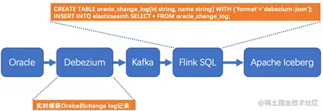 Oracle的变更日志的采集有多种方案,这里采用的Debezium实时同步工具作为示例,该工具能够解析Oracle的changlog数据,并实时同步数据到下游Kafka。Flink SQL通过创建Kafka映射表并指定 format格式为debezium-json,然后通过Flink进行解析后直接插入到其他外部数据存储系统,例如图中外部数据源以Apache Iceberg为例。