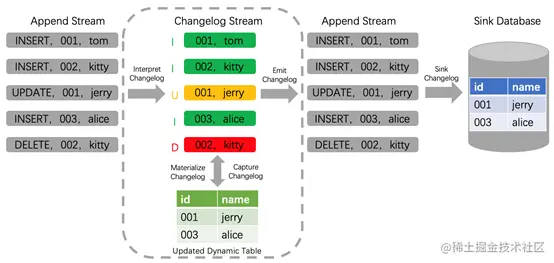 其次再来看一下Flink SQL内部是如何处理update记录的。Flink在1.11版本支持了完整的changelog机制,对于每条数据本身只要是携带了相应增、删、改的标志,Flink就能识别这些数据,并对结果表做出相应的增、删、改的动作,如下图所示changlog数据流经过Flink解析,同步到下游Sink Database。