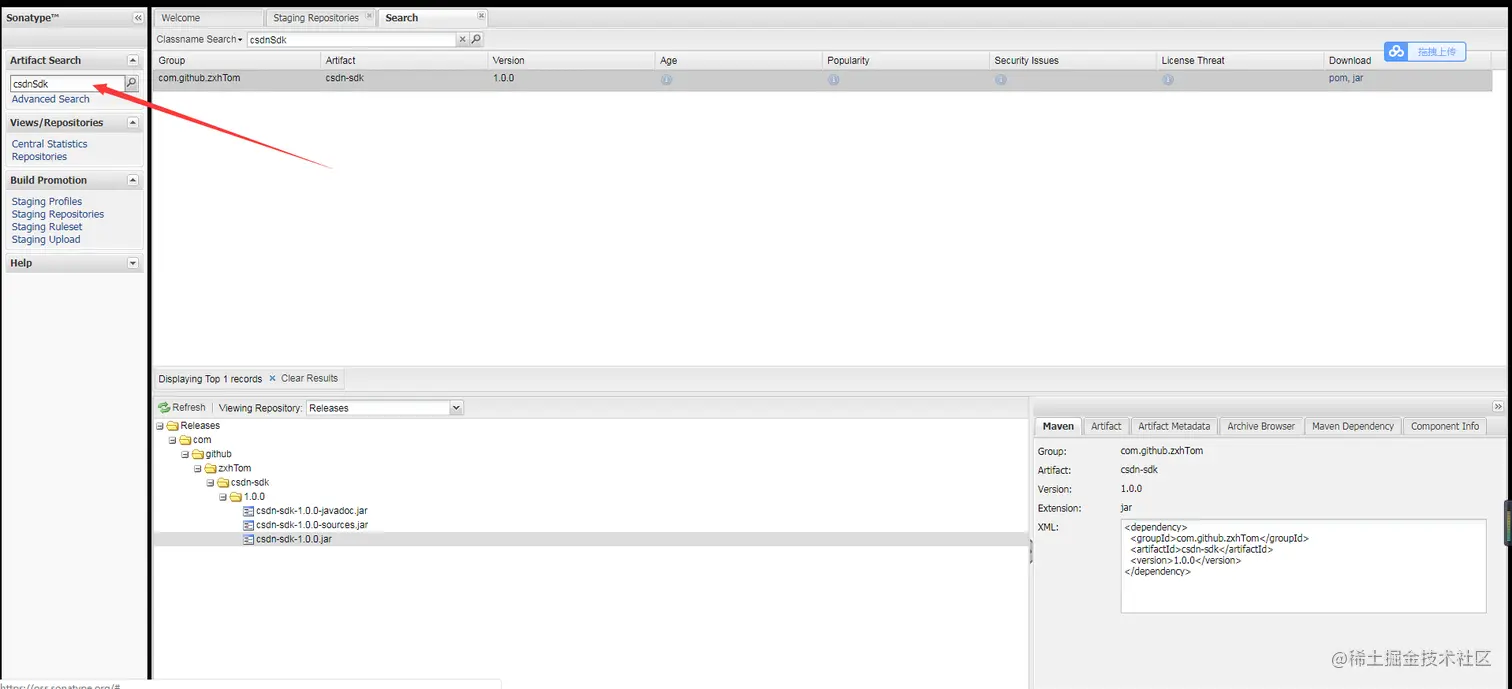 - release成功之后再staging repositories就消失了。在左侧搜索 , 搜索到就表示成功,我们等待就会在中央仓库搜索到我们项目