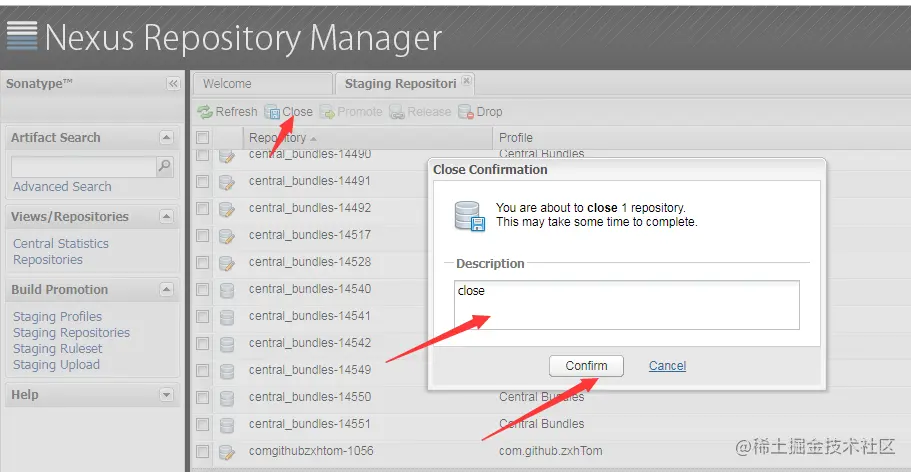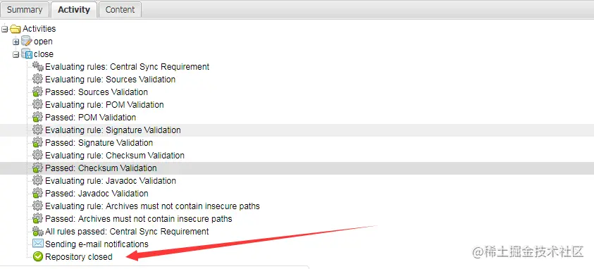 - 我们查看到的信息是open状态,我们需要注意这个状态,需要open-->close-->relese 。 最后才会发布到中央仓库,然后同步到其他maven需要一定时间可能需要几天 close的时候需要看信息,close失败会在activity中提示你哪些错误的。还有些pom细节这里不能细说了,时间问题