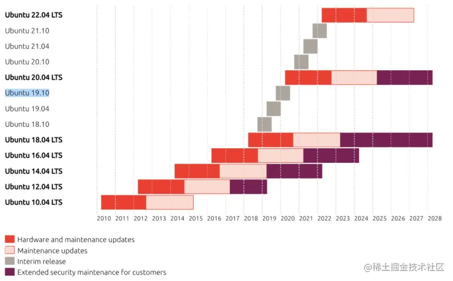 Ubuntu 19.10 生命周期将在今年 7 月结束,之后一段时间内最大的版本则是 Ubuntu 20.04 LTS,其重大更新和改进将在 2030 年前终止。