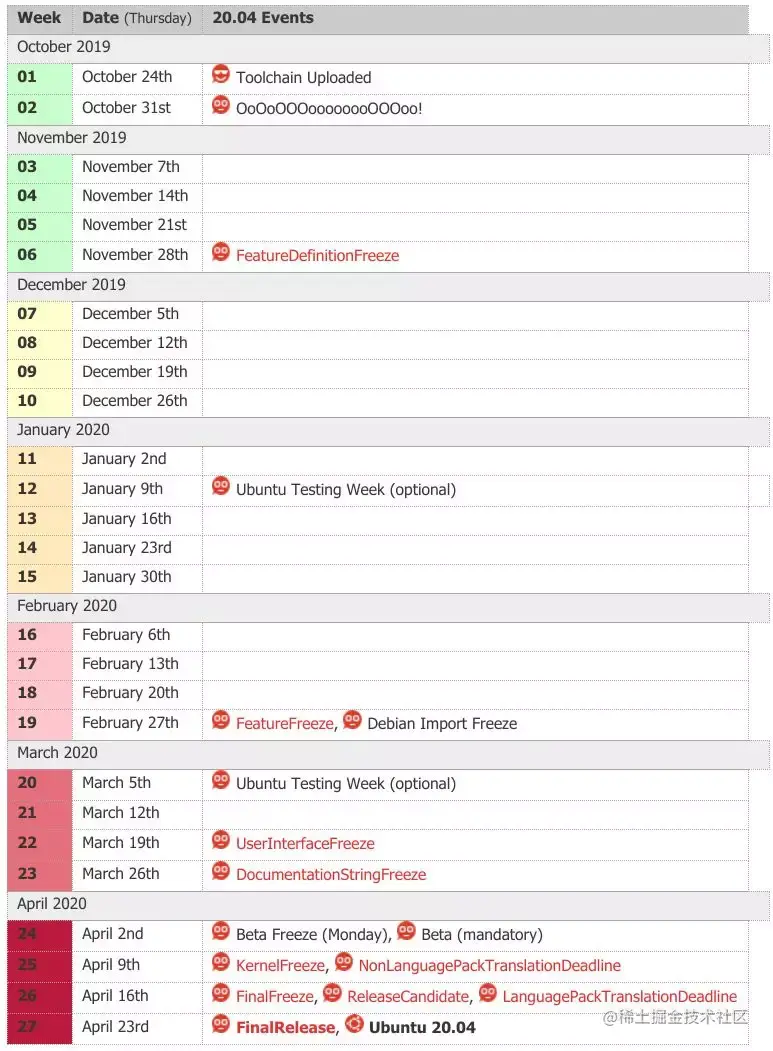 20.04 是 Ubuntu 的第 8 个 LTS 版本,计划于明年 4 月 23 日发布。Canonical 会为 10 份月发布的版本制定 25 周时间表和 4 月发布的版本制定 27 周时间表来指导 LTS 的发展,Ubuntu 20.04 的开发生命周期遵循的正是 27 周的发布时间表。