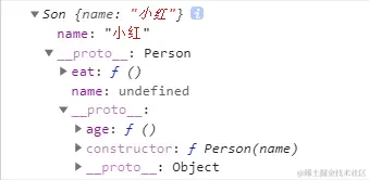 打印son的是候我们可以发现,通过原型链我们继承到了父类Person的方法,同时也有我们自己给Son的prototype添加的方法;