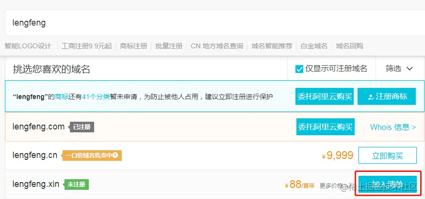 选择未被注册的域名,加入“清单”。