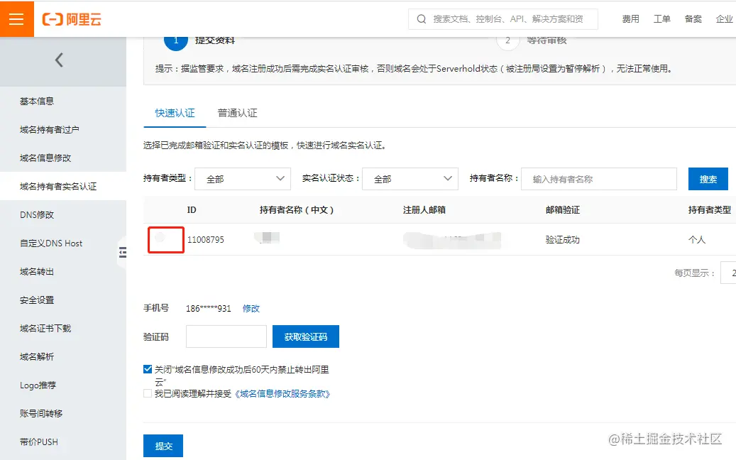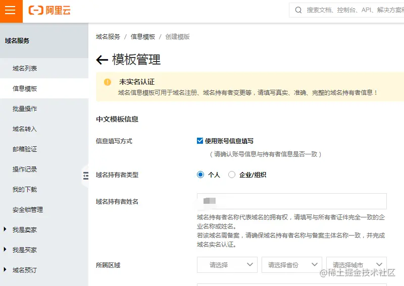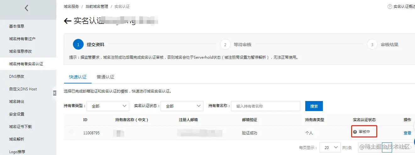 - “实名信息模板”审核通过之后,才进行域名的实名认证。