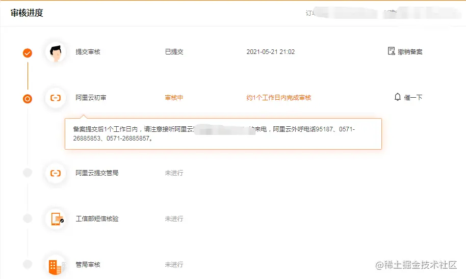 - 做完上述 4 步后,剩下的就是等待阿里云审核、工信部审核和管局审核了。
