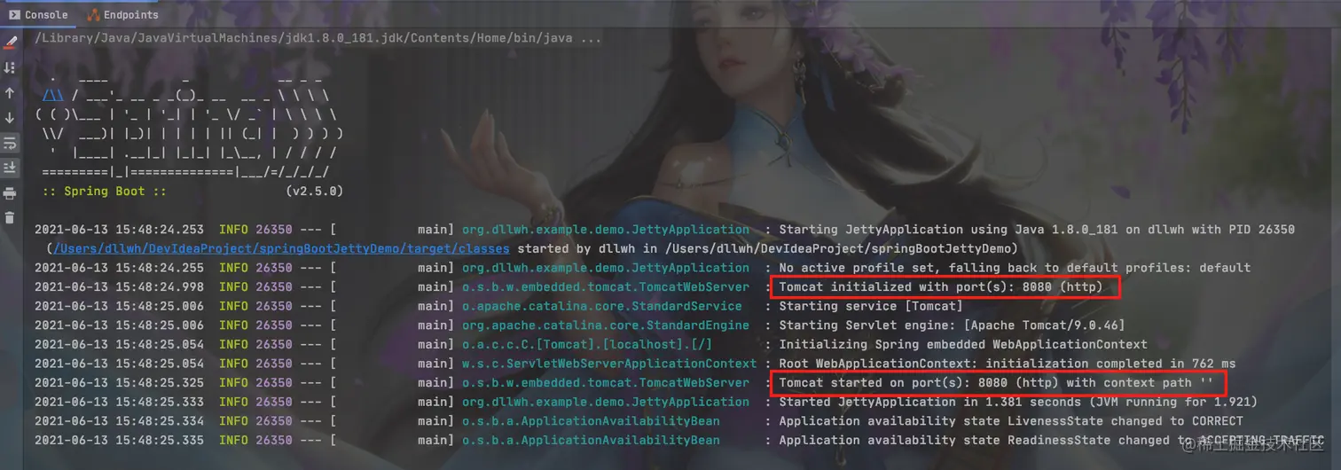 在我们使用 SpringBoot 开发Web应用时,会引入spring-boot-starter-web这个starter组件,其内嵌 Jetty , Tomcat , Undertow三种servlet 容器供大家选择,默认是Tomcat容器,所以我们平时新建项目启动起来,会看见Tomcat相关的一些信息,如下图所示,可以看出 Spring Boot 默认使用的是 Tomcat 容器启动的。