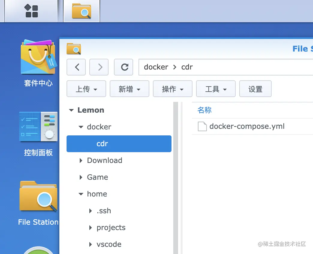 登陆群晖 Web 界面,在容器运行目录下创建一个名为 “cdr” 的目录,后续存放容器配置文件,并在个人 home 目录创建两个名为“vscode”和“project”的目录,用于稍后存放 vscode 配置和项目文件和数据。