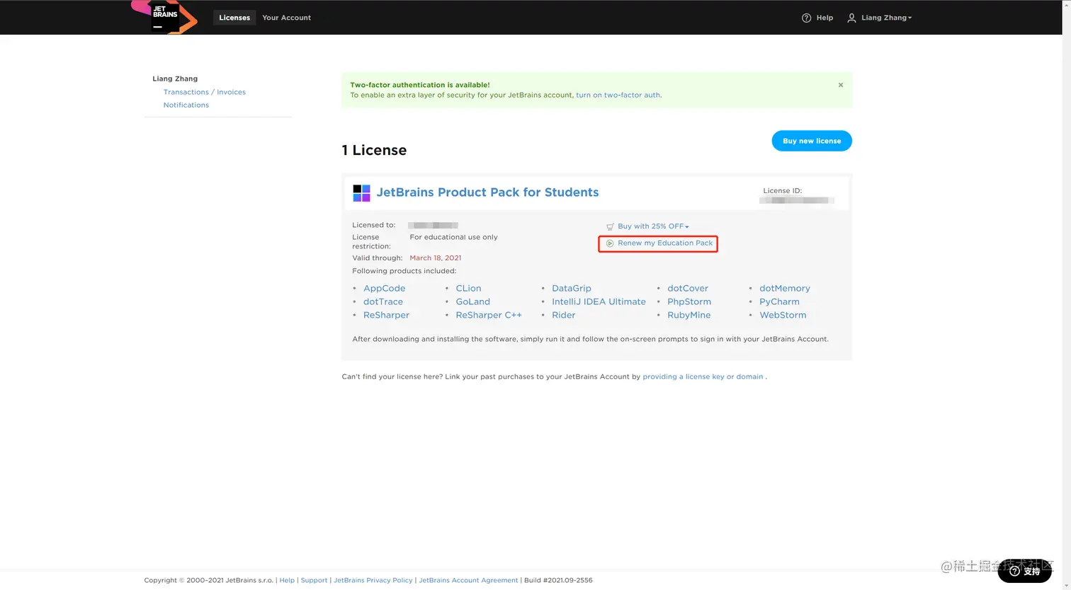 这个时候,我们需要到官网进行续期,登录之后,我们只需要在 License 页面点击 Renew my Education Pack ,然后我们确认相关信息之后,它就会发送续期邮件到我们的邮箱。