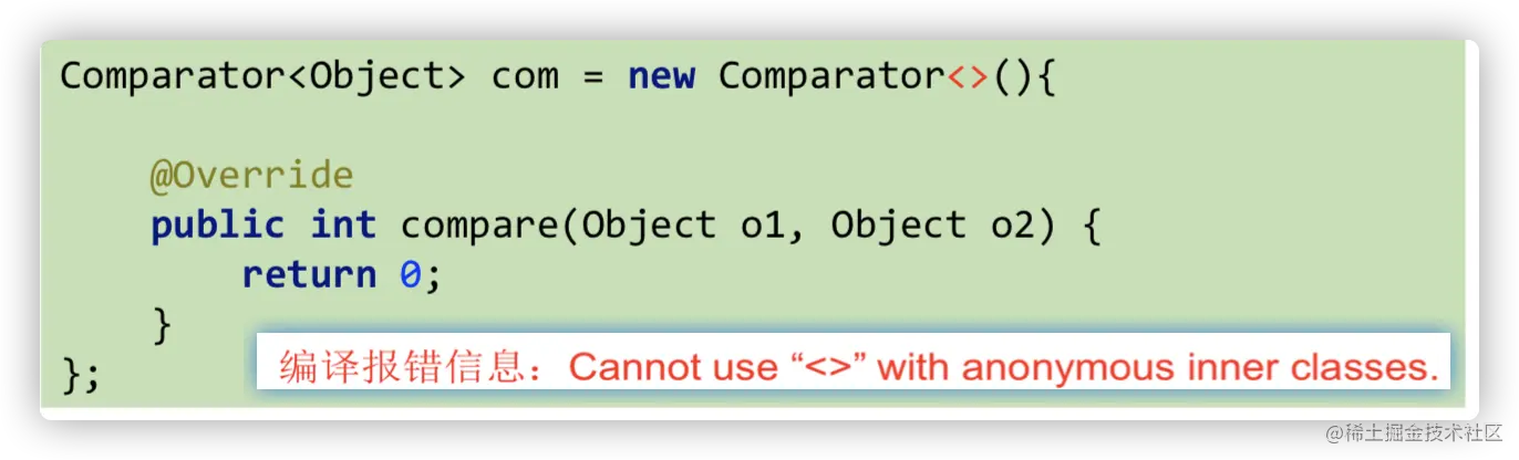 在Java 8匿名实现类与钻石操作符(diamond operator)共同使用,在编译期间会报错,如下: