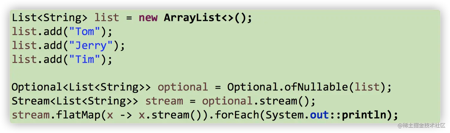 Java 8 中 Stream 不能完全为null,否则会报空指针异常。而 Java 9 中的 ofNullable 方 法允许我们创建一个单元素 Stream ,可以包含一个非空元素 ,也可以创建一个空 Stream。