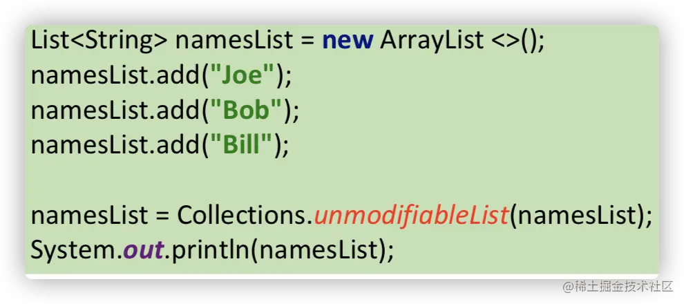 在Java 8 及以前我们要创建一个只读的集合,需要进行一系列如下的繁琐步骤: