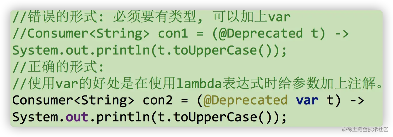 在var上添加注解的语法格式,在jdk10中是不能实现的。在JDK11中加入了这样 的语法。