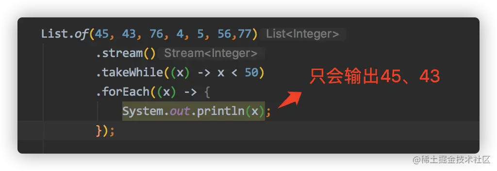 takewhile() 方法接受所有值,直到谓词返回false为止,才停止。也就是从第1个元素一直往后判断,符合条件的就进行处理,如果中间遇见一个不符合的,整个流程结束。
