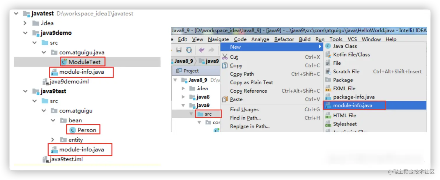 比如下面,创建了2个模块,java9demo 和java9test , 并在Java代码结构的顶层创建了module-info.java文件。