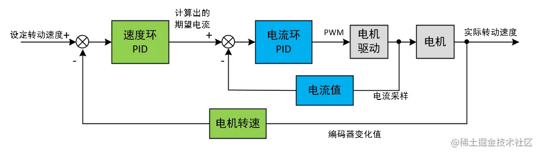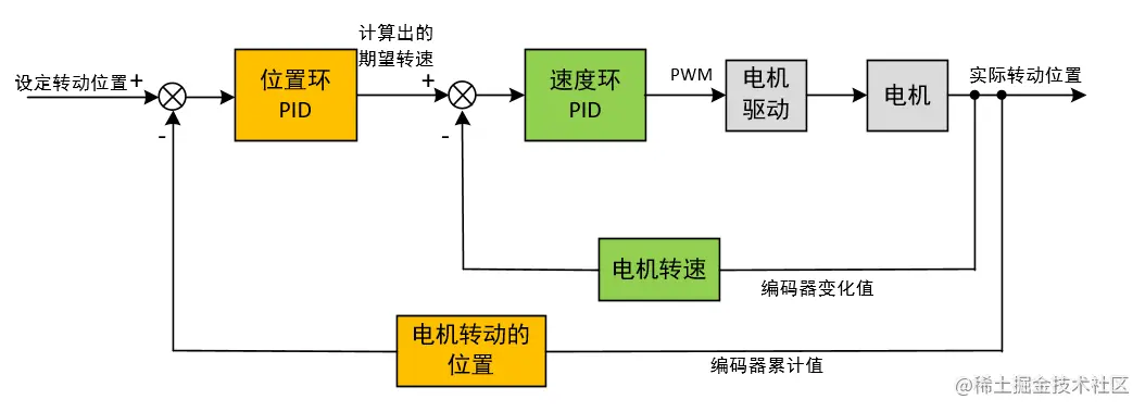 由于我的电机没有电流测量电路,所以,本文以位置环+速度环来学习PID串级控制。就是按照下面这个图: