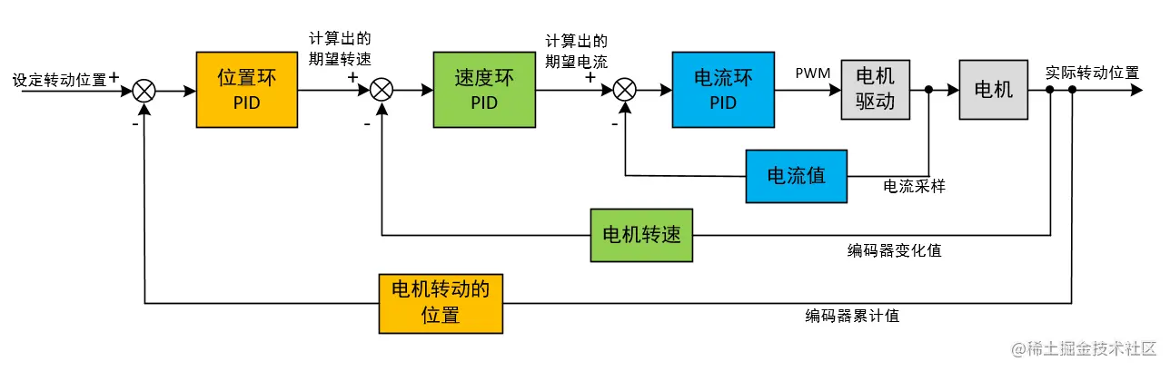 PID串级控制的典型结构为位置环+速度环+电流环,如下图。