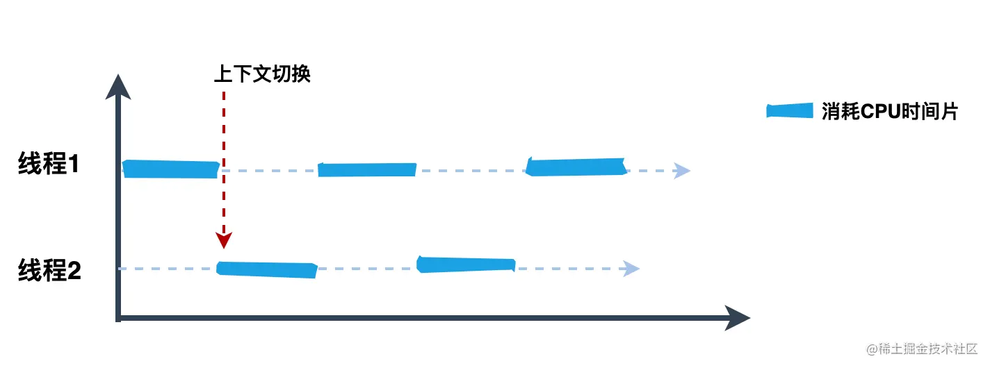 CPU是很宝贵的资源速度也非常快,为了保证雨露均沾,通常为给不同的线程分配时间片,当CPU从执行一个线程切换到执行另一个线程时,CPU 需要保存当前线程的本地数据,程序指针等状态,并加载下一个要执行的线程的本地数据,程序指针等,这个开关被称为『上下文切换』。