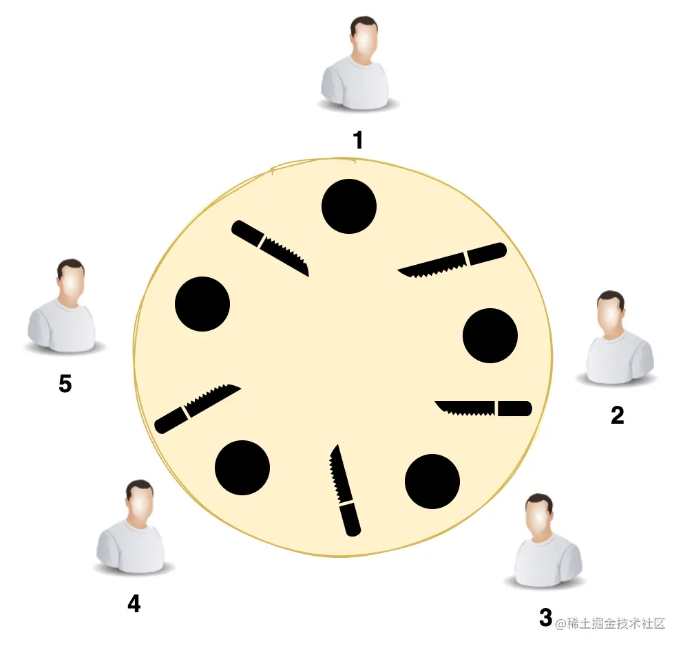 有一个非常经典的饥饿问题就是哲学家用餐问题,如下图所示,有五个哲学家在用餐,每个人必须要同时拿两把叉子才可以开始就餐,如果哲学家1和哲学家3同时开始就餐,那哲学家2、4、5就得饿肚子等待了。