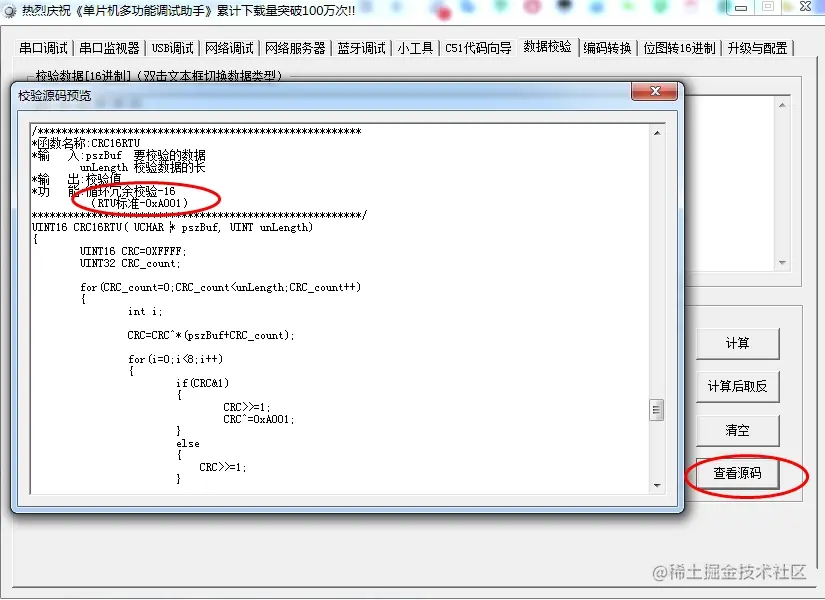 在软件右下角有个查看源码的按钮,这个点开后,作者分享了各种校验码计算的源码。