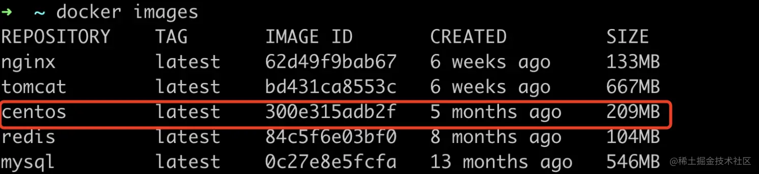 这里我们通过案例来证明一下,这是我本地已经下载好的镜像包,大家可以看到centos这个镜像包的大小才209M,平时我们安装的虚拟机上的centos都是几个G,这个里为什么200M就可以?这里我们的centos镜像文件只是一个最精简的rootfs版本,与底层系统共用了kernel,所以才200M就可以将一个centos跑起来,对于不同发行版本可能这个大小会略微有所不同。