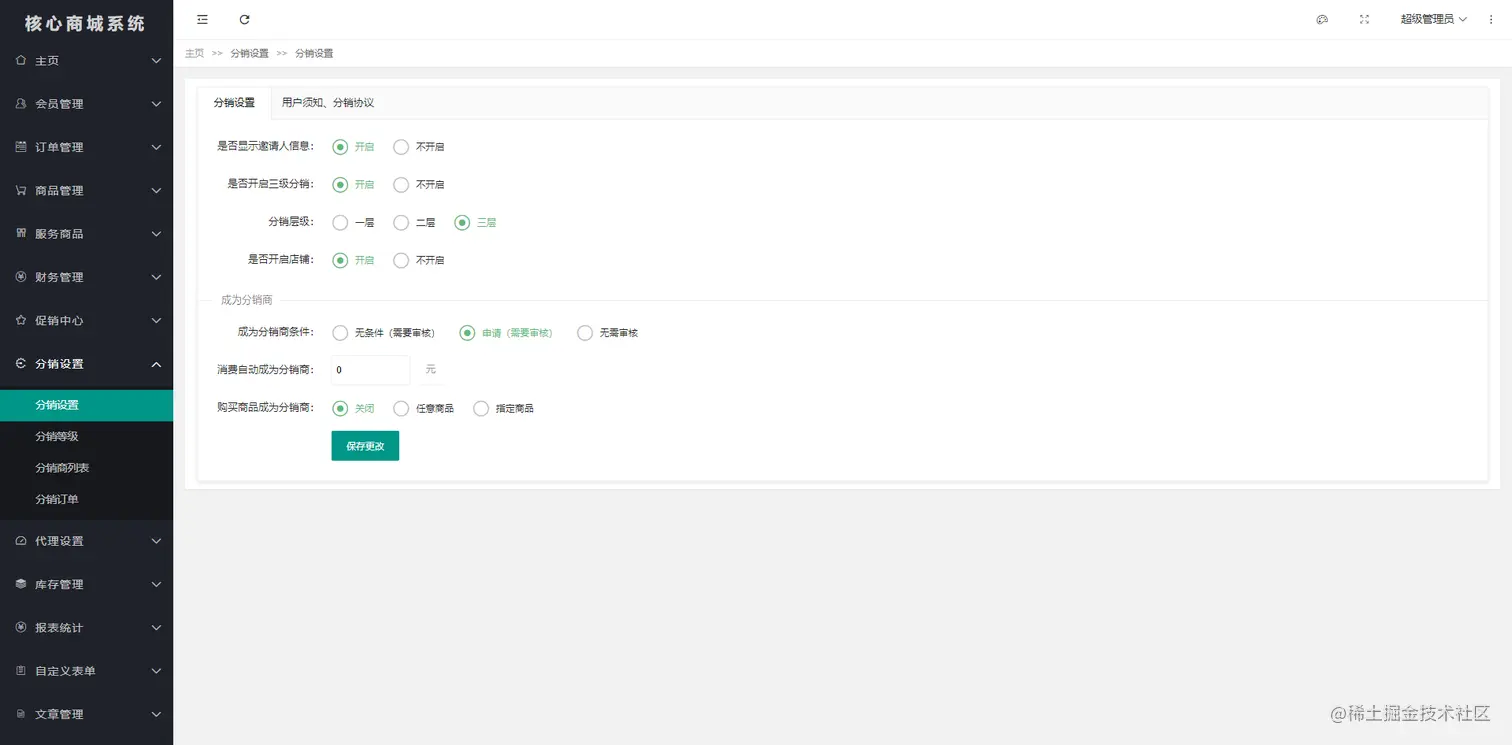 - 分销管理:分销设置、分销等级、分销商管理、分销商订单