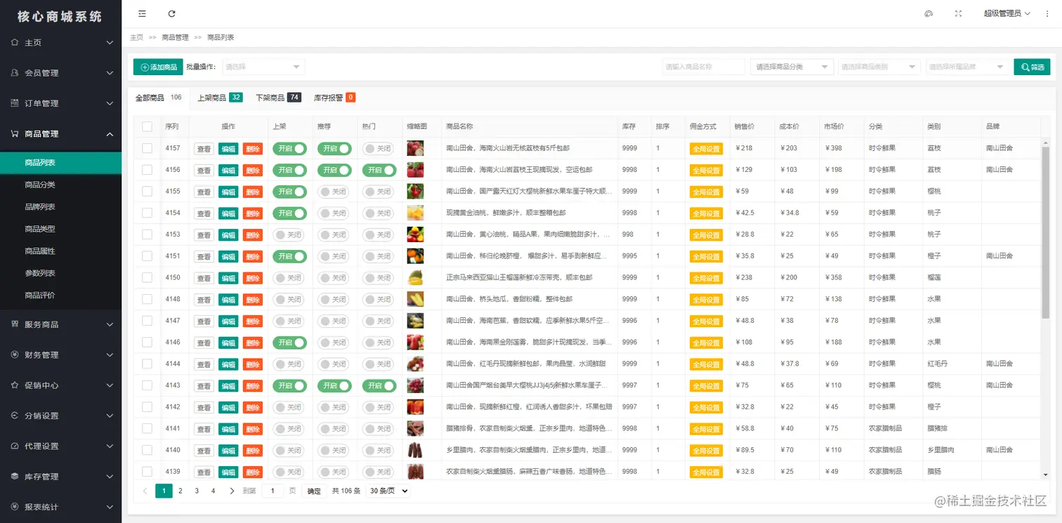 - 商品管理:单规格、多规格商品管理;品牌、分类管理;商品属性、商品参数及类型管理;商品评价。