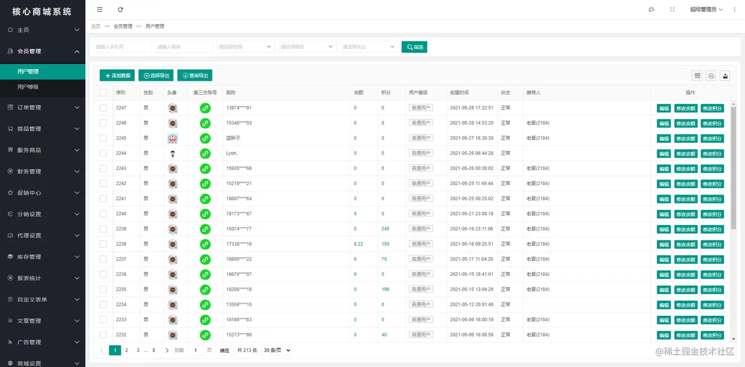 - 商城设置:首页布局管理、页面可视化操作、公告管理、商城服务细则设置、配送方式及运费设置、物流公司列表、行政三级区划