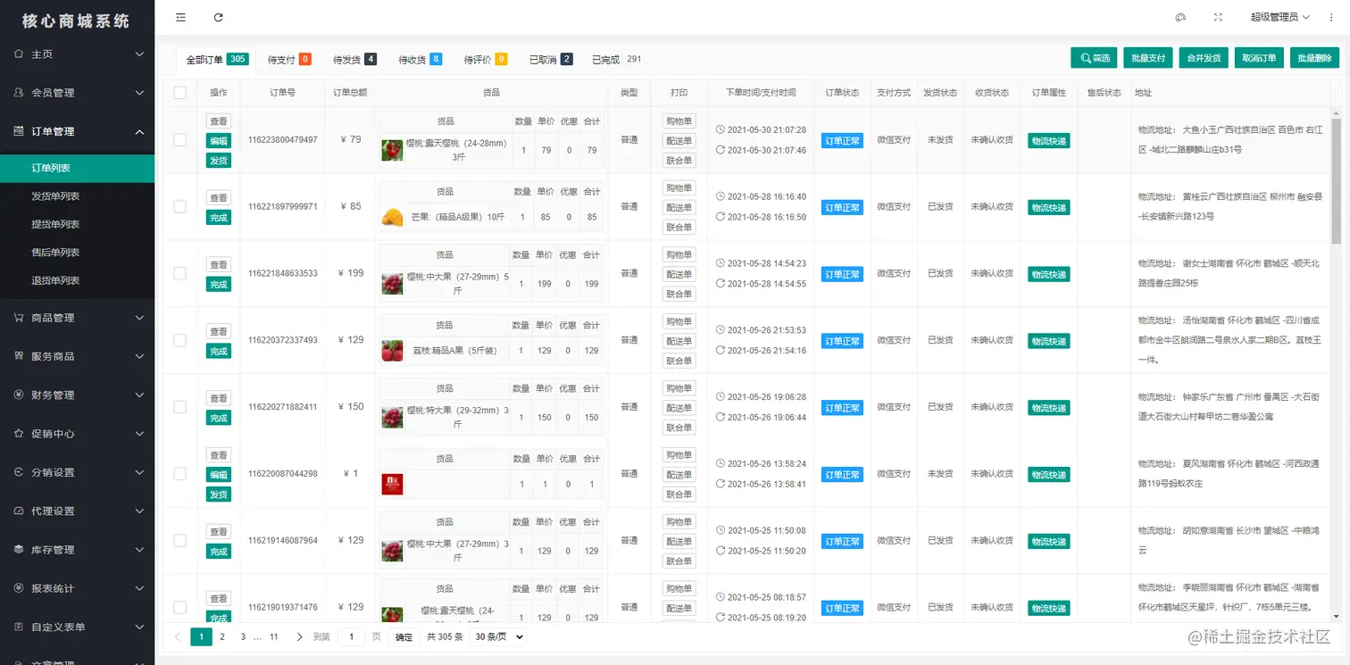 - 订单管理:订单列表,订单支付、发货、取消、售后等;划分发货单,提货单,售后单,退款单;支持购物单,配送单,联合单在线打印。